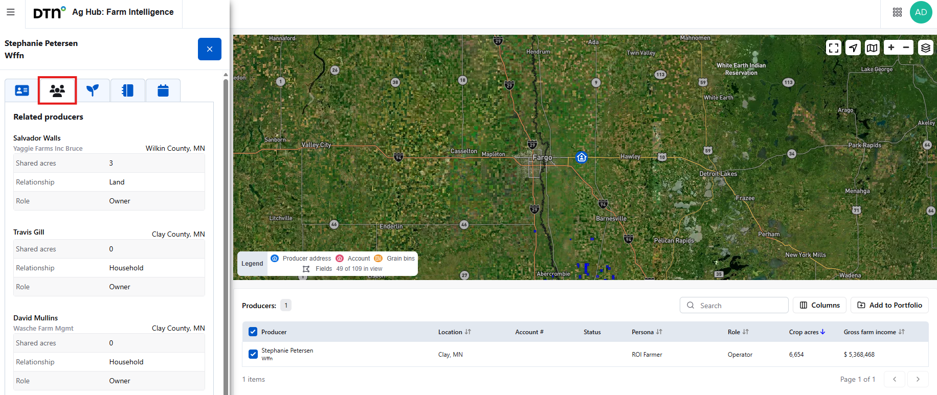 The “Related Producers” tab is located in the drawer that opens on the left side of the page when you select a producer from the map or list. This tab displays the different ways a producer may be connected to other individuals or entities in the system.